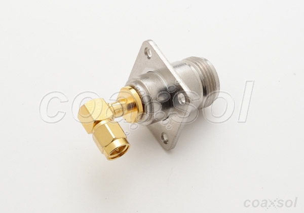 N Female 4 Hole Panel Mount to SMA Male Right Angle Adapter